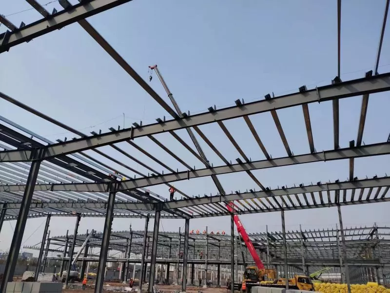 Atariko altzairuzko egituraren osagaiak deskargatu eta eraikuntza planaren arabera muntatzen dira.